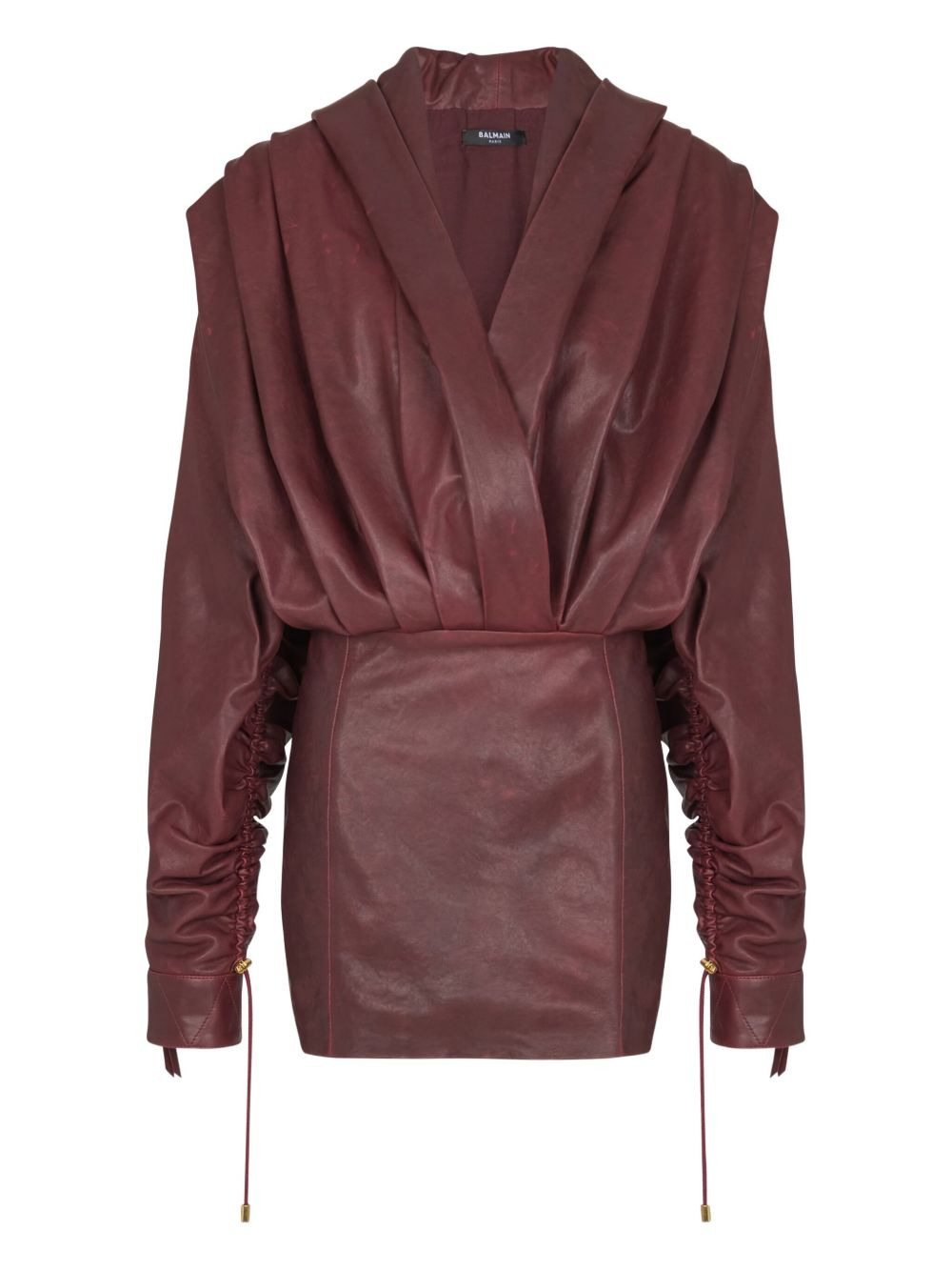hooded draped leather mini dress Highlights - Dark red - Draped neckline - Drawstring cuffs - Leather Imported Composition Outer: Lamb Skin 100% Lining: Viscose 52%, Cotton 48% Washing instructions Read Manufacturer Guidelines