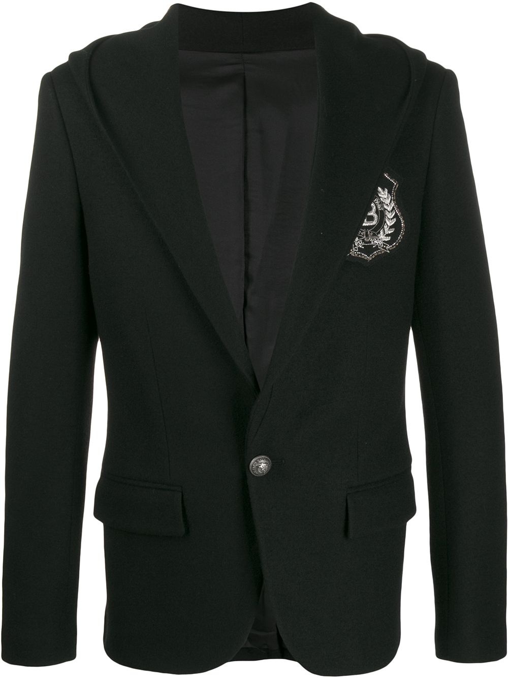 hooded logo patch blazer The designer infuses Balmain’s signature glamour and lavish embellishments into classic wardrobe staples, presenting a collection of wearable yet striking silhouettes and statement shoes for the everyday wear or those very special occasions. This black hooded logo patch blazer is crafted from wool and cotton and features a v-neck, an embroidered logo to the front, a front button fastening, long sleeves, side flap pockets, button cuffs and a back slit at hem. Made in Italy Composition Lining: Cotton 100%, Viscose 57%, Polyester 43% Outer: Wool 100% SIZE & FIT Model measurements Height 6 ft 1 in(1.85 m) Bust/Chest 37.79 in(96 cm) Hips 37.4 in(95 cm) Waist 30.7 in(78 cm) FittingInformation This piece fits true to size. We recommend you get your regular size Cut for a slim fit Made with a mid-weight fabric Washing instructions Dry Clean Only