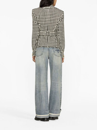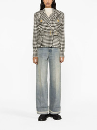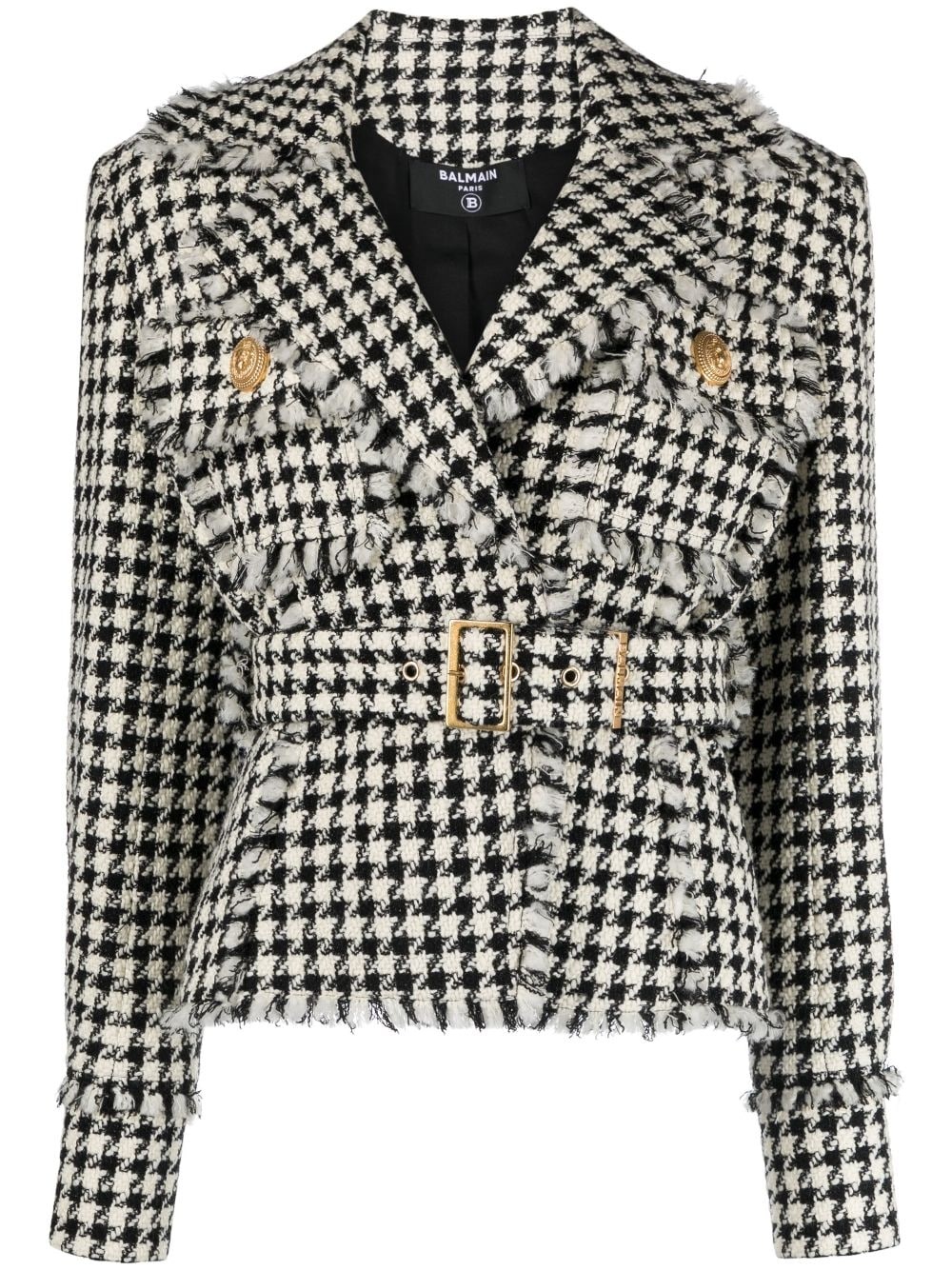 houndstooth tweed belted jacket Highlights - White/black - Virgin wool blend - Tweed - Houndstooth pattern - Embossed gold-tone buttons - Frayed edge - Wide notch lapels - Belted waist - Shoulder pads - Long sleeves - Chest flap pockets - Cropped Imported Composition Outer: Virgin Wool 89%, Polyamide 4%, Viscose 4%, Cashmere 2%, Metallized Polyester 1% Lining: Viscose 52%, Cotton 48% SIZE & FIT Model measurements Height 5 ft 10 in(1.78 m) Bust/Chest 31.49 in(80 cm) Hips 35.03 in(89 cm) Waist 23.62 in(60 cm) Measurement SLEEVE LENGTH 19.68 in(50 cm) LENGTH 24.4 in(62 cm) WAIST 34.64 in(88 cm) BUST 40.94 in(104 cm) FittingInformation Designed for a slim fit that sits just away from the body offering a close yet comfortable fit The internal shoulder pads offer a structured shape Made from a midweight non-stretch fabric This piece fits true to size – take your usual size