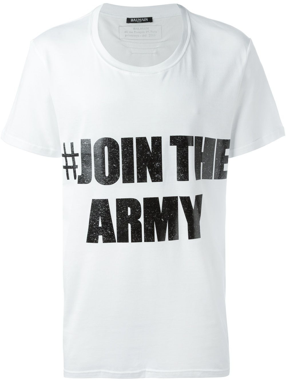 #Join the Army T-shirt White cotton #Join the Army T-shirt from Balmain featuring a round neck, short sleeves and a straight hem. Made in France Composition Cotton 100% SIZE & FIT Model measurements Height 6 ft 2 in(1.87 m) Bust/Chest 37.79 in(96 cm) Hips 37.79 in(96 cm) Waist 30.31 in(77 cm) Washing instructions Machine Wash