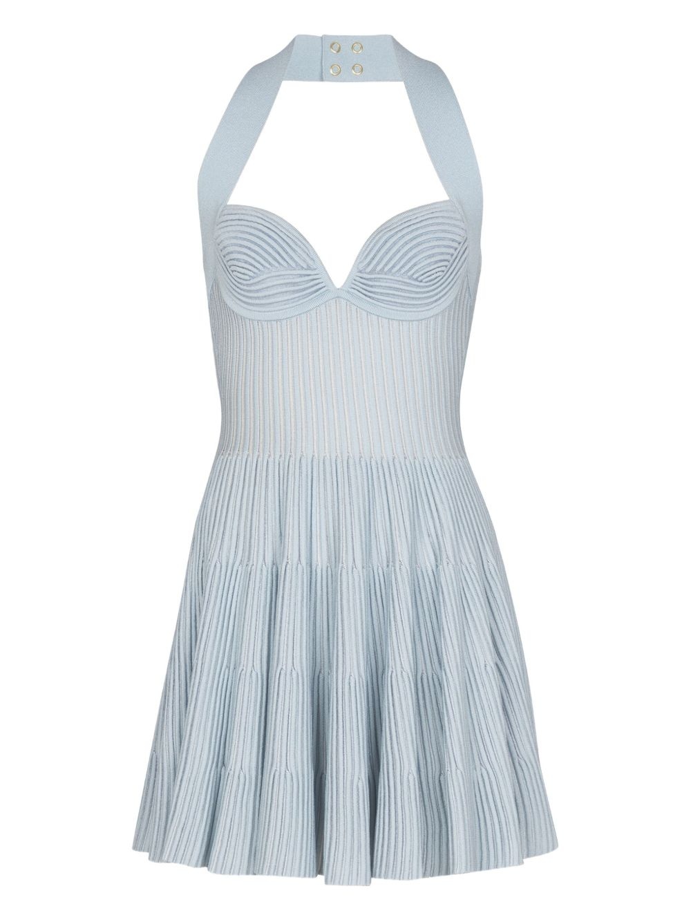 knitted A-line mini dress Highlights - Blue - Rear zip fastening - Halterneck - Thigh-length Made in Italy Composition Viscose 83%, Polyester 15%, Polyamide 2% Washing instructions Read Manufacturer Guidelines