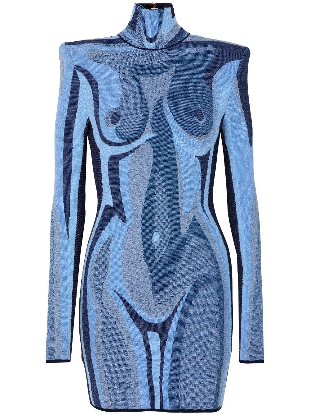 knitted mini dress Highlights - Blue - Knitted construction - All-over graphic print - High neck - Rear zip fastening - Long sleeves - Straight hem - Thigh-length Made in France Composition Viscose 60%, Fabric 24%, Polyester 16%