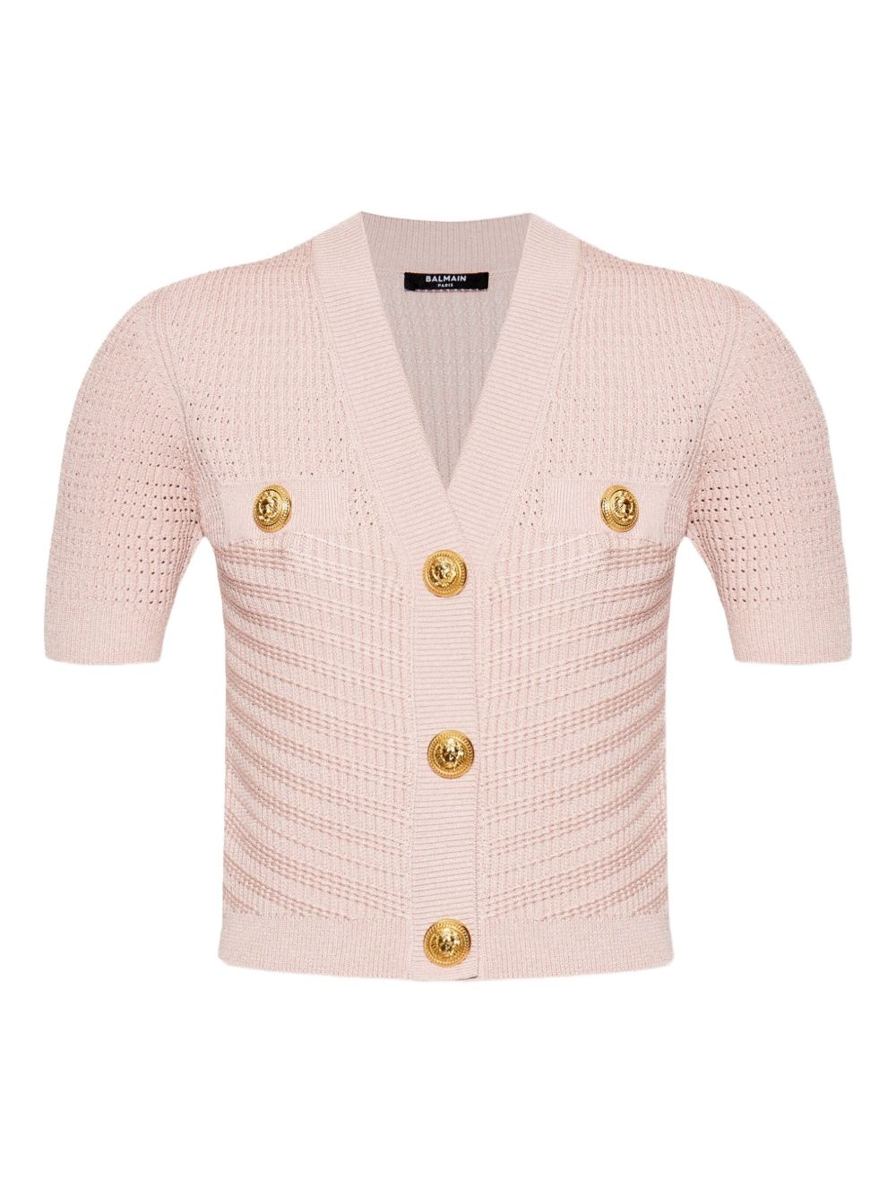 knitted top Highlights - Pink - V-neck - Decorative button detailing - Short sleeves - Straight hem Made in Italy Composition Viscose 84%, Polyester 16% Washing instructions Read Manufacturer Guidelines
