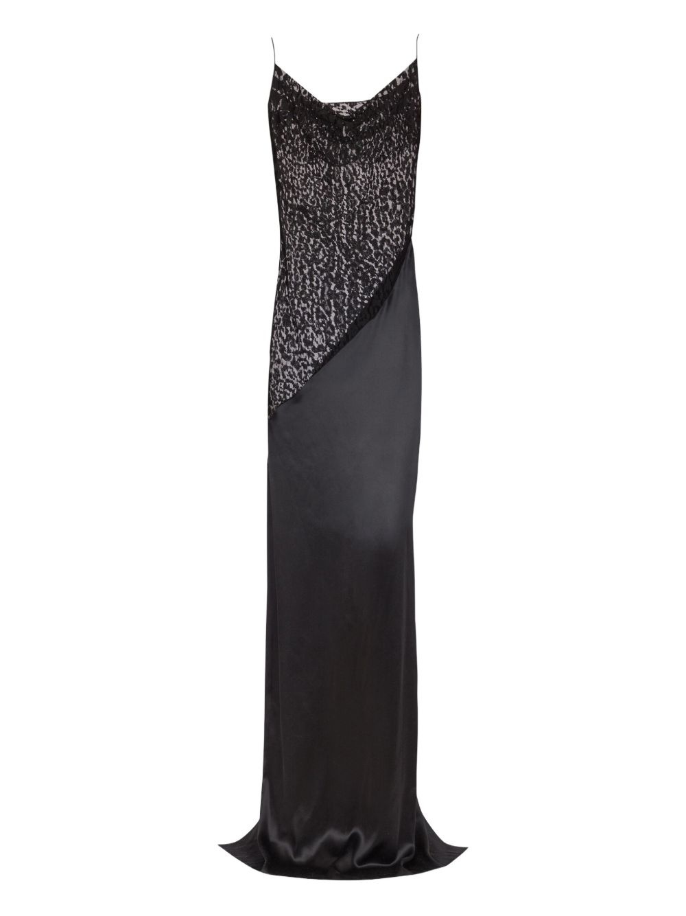 lace-embellished dress Highlights - Black - Concealed side zip fastening - Thin shoulder straps - Cowl neck - Floor-length Made in France Composition Viscose 81%, Polyamide 19%