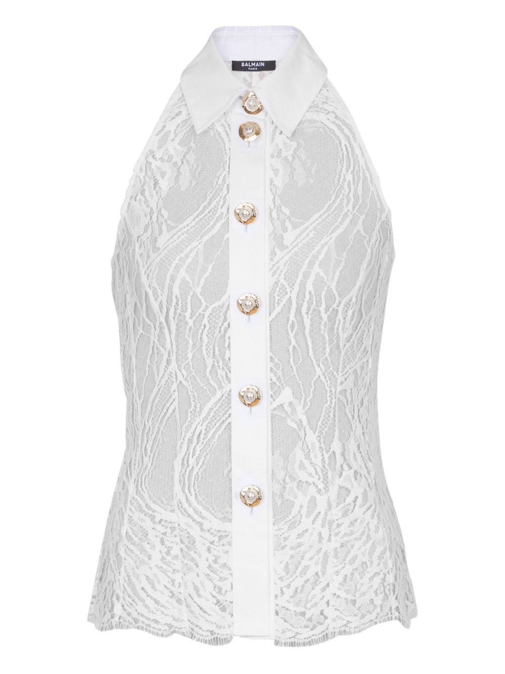 lace halterneck buttoned top Highlights - White - Lace fabric - Halterneck design - Button fastening - Gold-tone buttons Imported Composition Fabric 100% Washing instructions Specialist Cleaning