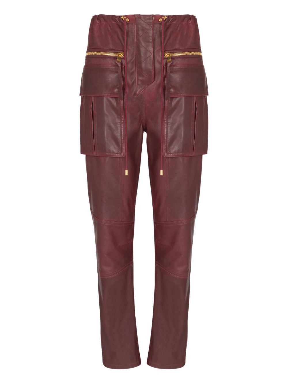 lambskin leather cargo straight trousers Highlights - Dark red - Lambskin leather - Multiple cargo pockets - Gold-tone zip fastening pockets - Drawstring waist Imported Composition Lamb Skin 100% Washing instructions Read Manufacturer Guidelines