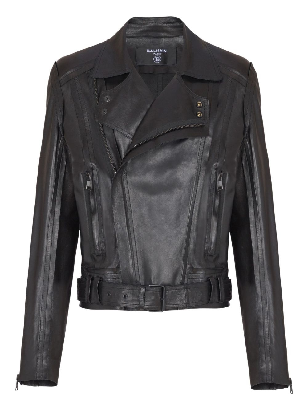 leather biker jacket Highlights - Black - Off-centre front zip fastening - Two side zip-fastening pockets - Cuff zips - Belted waist Imported Composition Lambskin 100% Washing instructions Specialist Cleaning