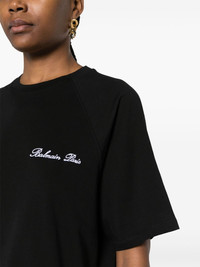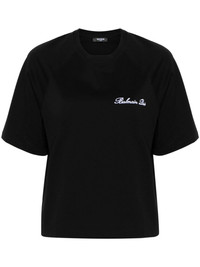logo-embroidered cotton T-shirt Balmain's T-shirt is cut from soft cotton to a boxy silhouette with a classic crew-neck design and short raglan sleeves. The brand's moniker appears embroidered at the chest in contrasting white. Highlights - Black - Cotton - Soft jersey - Embroidered logo at the chest - Crew neck - Short raglan sleeves - Straight hem Imported Composition Cotton 100% SIZE & FIT Model measurements Height 5 ft 11 in(1.8 m) Bust/Chest 31.49 in(80 cm) Hips 36.61 in(93 cm) Waist 24.4 in(62 cm) FittingInformation Designed to be unstructured, offering a loose fit throughout Made from a midweight non-stretch fabric, this piece offers minimal elasticity when worn This piece fits true to size – take your usual size Washing instructions Machine Wash