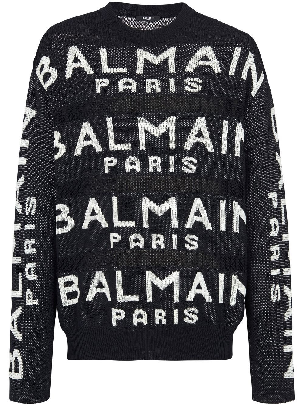 logo-intarsia knitted jumper A love for logomania is apparent in the latest collection from Balmain. This jumper formed part of the lineup and presents a contrasting intarsia-knit for a branded touch. Made in Italy Composition Body: Wool 100% SIZE & FIT Measurement CHEST 48.81 in(124 cm) SLEEVE LENGTH 36.22 in(92 cm) LENGTH 27.16 in(69 cm)