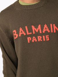 Khaki wool sweater with orange Balmain Paris logo