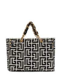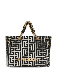 logo-plaque tote bag Taking its name from Balmain’s inaugural year, this black 1945 Soft tote bag is crafted from fabric with expandable sides and a plethora of gold-tone hardware – from the chain-link straps and logo lettering to the metal feet. Highlights - Black/white - Cotton blend - Monogram pattern - Gold-tone logo plaque - Two top handles - Chain-link detailing Made in Italy Composition Body: Cotton 84%, Polyester 16%