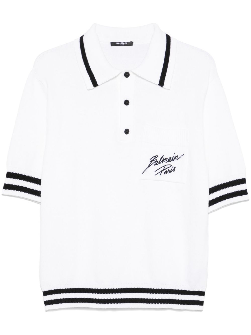 logo signature-embroidered polo shirt Highlights - White - Short front button fastening - Chest patch pocket - Ribbed cuffs and hem - Stripe detailing Made in France Composition Lyocell 44%, Cotton 44%, Polyamide 12% SIZE & FIT Model measurements Height 6 ft 1 in(1.85 m) Bust/Chest 38.58 in(98 cm) Hips 37 in(94 cm) Waist 30.31 in(77 cm) FittingInformation Designed for a relaxed fit, this polo shirt offers comfort and movement The ribbed hem offers a close, comfortable fit Made with a midweight knit, this piece offers some stretch
