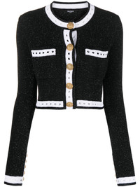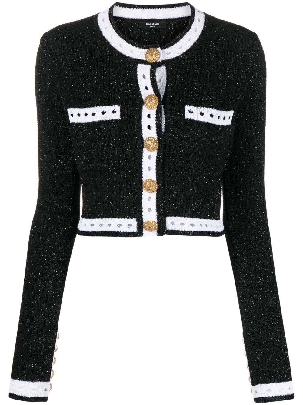 long-sleeve button-fastening cardigan Balmain's refined design style is showcased on this button-fastening cardigan from the AW23 collection which has a timeless two-tone palette and gold-tone buttons adding an element of opulence. Highlights - Black/white - Cotton - Crew neck - Long sleeves - Front button fastening - Cropped Made in Italy Composition Virgin Wool 53%, Polyester 44%, Cotton 2%, Polyamide 1% SIZE & FIT Model measurements Height 5 ft 10 in(1.77 m) Bust/Chest 32.67 in(83 cm) Hips 35.43 in(90 cm) Waist 23.62 in(60 cm) FittingInformation Designed for a slim fit that sits just away from the body offering a close yet comfortable fit Made with a midweight knit, this piece offers some stretch This piece fits true to size – take your usual size