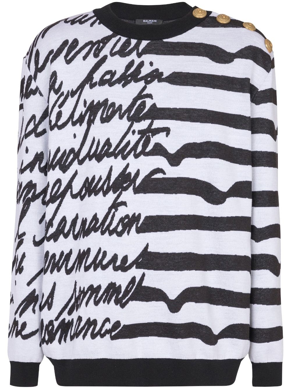 Love Letter-intarsia jumper Highlights - White/black - Merino wool blend - Patterned intarsia knit - Button fastening at the shoulder - Crew neck - Horizontal stripe pattern - Lion head motif - Drop shoulder - Long sleeves - Ribbed trim - Straight hem Made in France Composition Merino 66%, Cotton 20%, Fabric 14% Washing instructions Specialist Cleaning