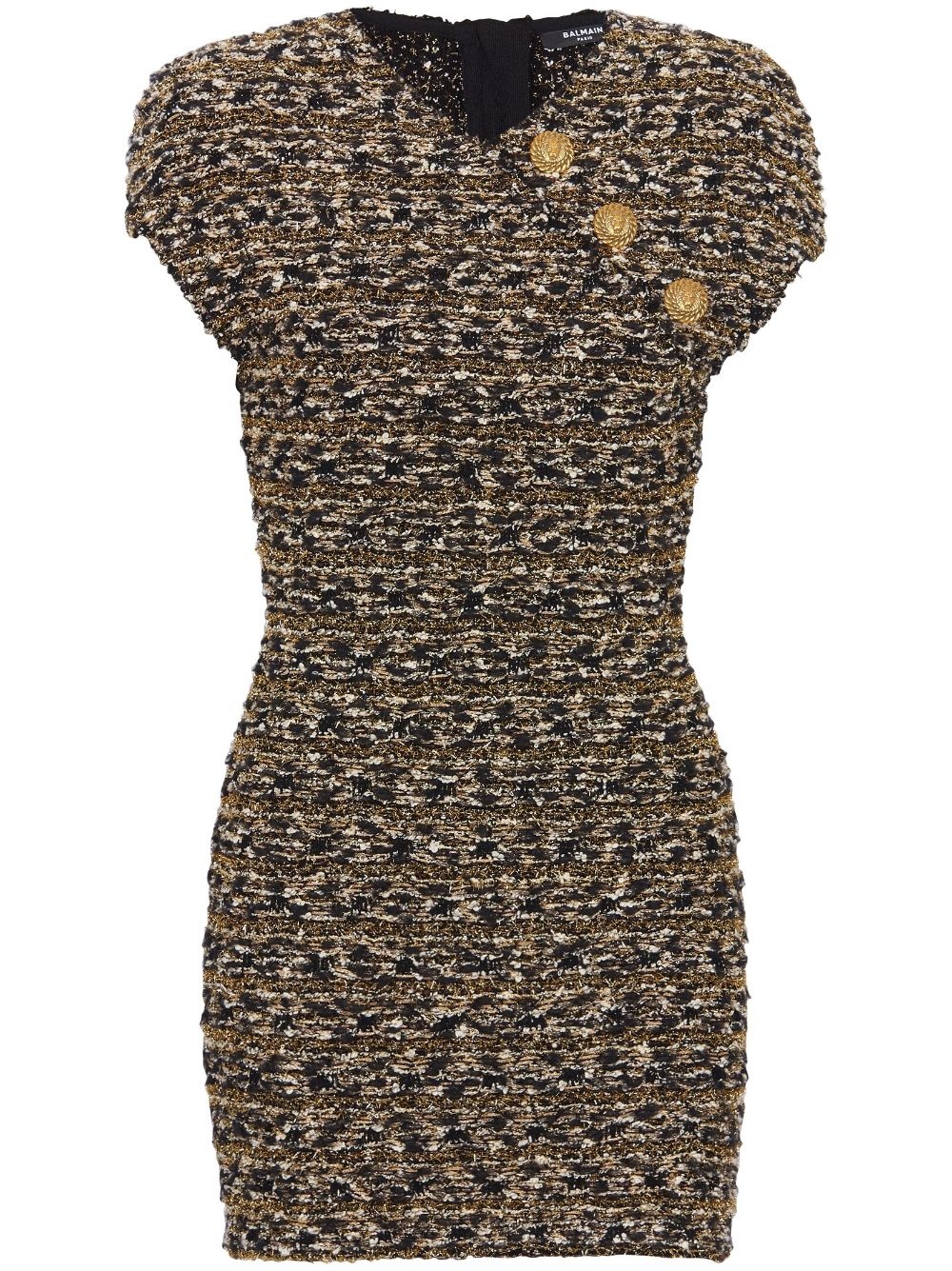 lurex tweed minidress Highlights - Black/gold-tone - Tweed - Lurex detailing - Gold-tone buttons - V-neck - Rear zip fastening - Short sleeves - Straight hem - Thigh-length Made in France Composition Body: Polyester 52%, Viscose 48% Washing instructions Specialist Cleaning