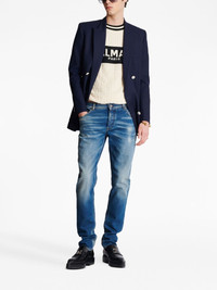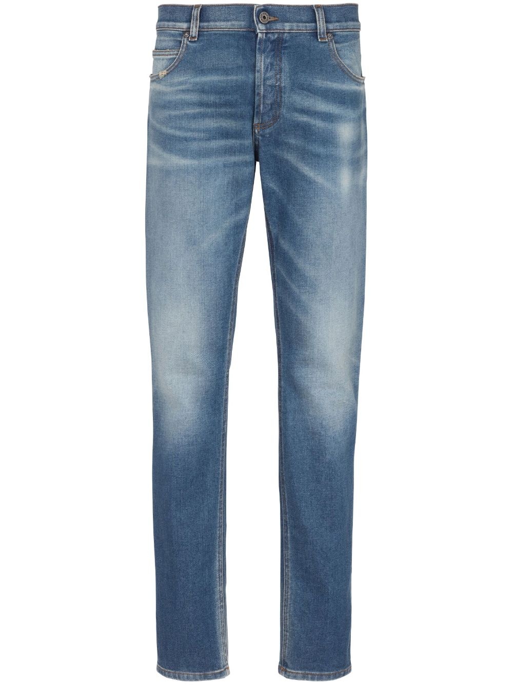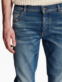 mid-rise slim-fit jeans Balmain delivers a timeless silhouette with these blue jeans. Detailed with subtle whiskering at the thighs, this slim-fit pair is finished with marigold stitching and a petite logo plaque at the rear pocket. Highlights - Blue - Stretch-cotton - Mid-rise - Belt loops - Front button and zip fastening - Classic five pockets - Logo plaque - Whiskering effect - Contrast stitching - Slim cut Made in Italy Composition Body: Cotton 98% Elastane 2%