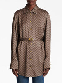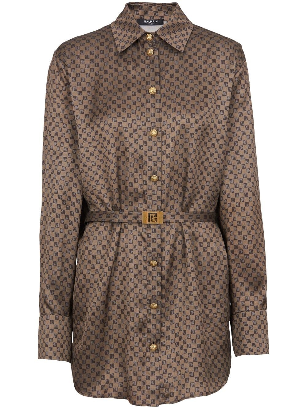 mini monogram-print silk shirt The PB monogram is an instantly identifiable insignia of the house, paying homage to the founder of the brand, Pierre Balmain. Here, the maze-like motif defines the construction of this brown shirt, lending an unmistakable look to the belted silhouette. Highlights - Coffee brown - Satin finish - Signature pb monogram print - Gold-tone logo plaque - Classic collar - Embossed gold-tone buttons - Belted waist - Long sleeves - Buttoned cuffs - Curved hem Made in France Composition Body: Viscose 100% Washing instructions Specialist Cleaning