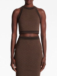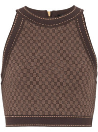 monogram-jacquard cropped top Decorated throughout with a repeated monogram pattern this cropped top exudes French elegance. It features a zip closure at the back for practicality. Highlights - Brown/beige - Merino wool blend - Merino wool blend - Halterneck - Rear zip fastening - Sleeveless - Cropped Made in France Composition Merino 80%, Polyamide 20% Washing instructions Specialist Cleaning