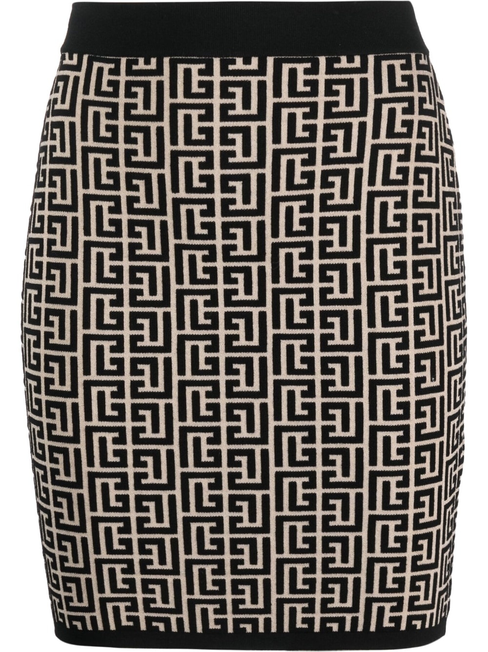 monogram-jacquard miniskirt Balmain's signature monogram pattern lends this miniskirt a graphic edge. It's jacquard-knit from a wool blend to a bodycon silhouette with solid-black trims. Highlights - Black/white - Wool blend - Monogram jacquard - High waist - Rear zip fastening - Thigh-length - Straight hem Made in Italy Composition Wool 59%, Viscose 21%, Polyamide 18%, Spandex/Elastane 2% SIZE & FIT Model measurements Height 5 ft 10 in(1.77 m) Bust/Chest 32.67 in(83 cm) Hips 35.43 in(90 cm) Waist 23.62 in(60 cm) Measurement HIPS 30.7 in(78 cm) LENGTH 18.11 in(46 cm) WAIST 23.62 in(60 cm) FittingInformation This mini-length skirt is intended to be worn high on the waist Made from a midweight stretch fabric, this piece offers elasticity and flexibility when worn This piece fits true to size – take your usual size Washing instructions Dry Clean Only