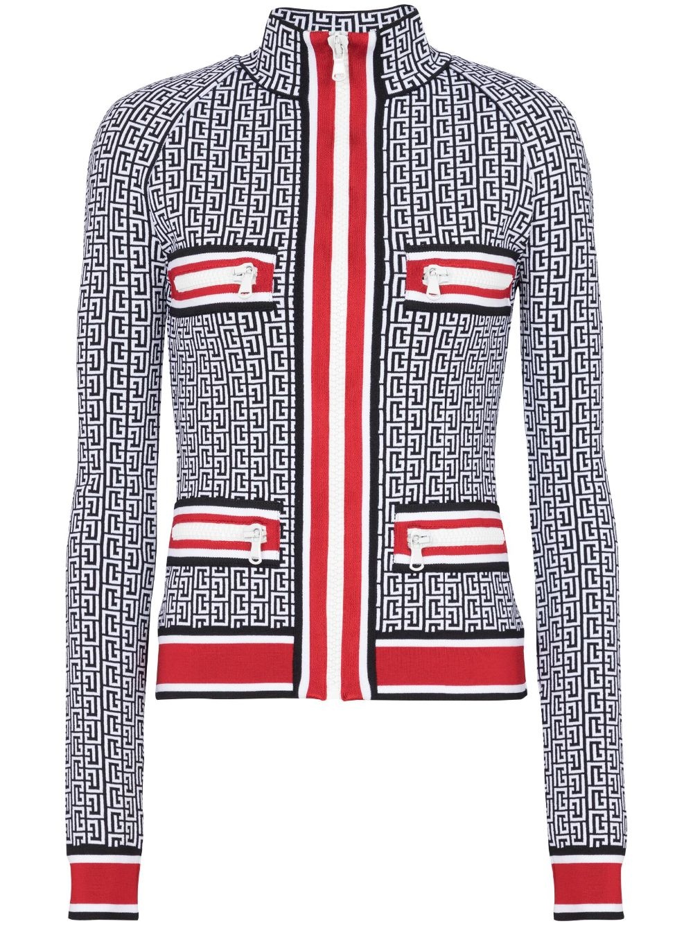 monogram-jacquard zip-up cardigan Highlights - Black - Red - White - Knitted construction - Monogram jacquard - High neck - Front zip fastening - Two zip-fastening chest pockets - Long sleeves - Two side zip-fastening pockets - Ribbed-knit edge - Slim cut Made in France Composition Viscose 86%, Other Materials 8%, Polyamide 6%