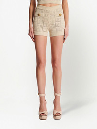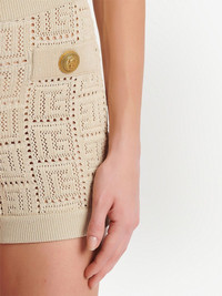 monogram mesh knitted shorts Highlights - Sand beige - Knitted construction - Embossed gold-tone buttons - Embossed monogram pattern - High waist Made in Italy Composition Body: Viscose 83%, Polyamide 17% SIZE & FIT Measurement FRONT RISE 11.02 in(28 cm) HIPS 38.58 in(98 cm) FittingInformation Designed for a close fit throughout Made with a midweight knit, this piece offers some stretch This piece fits true to size – take your usual size Washing instructions Specialist Cleaning