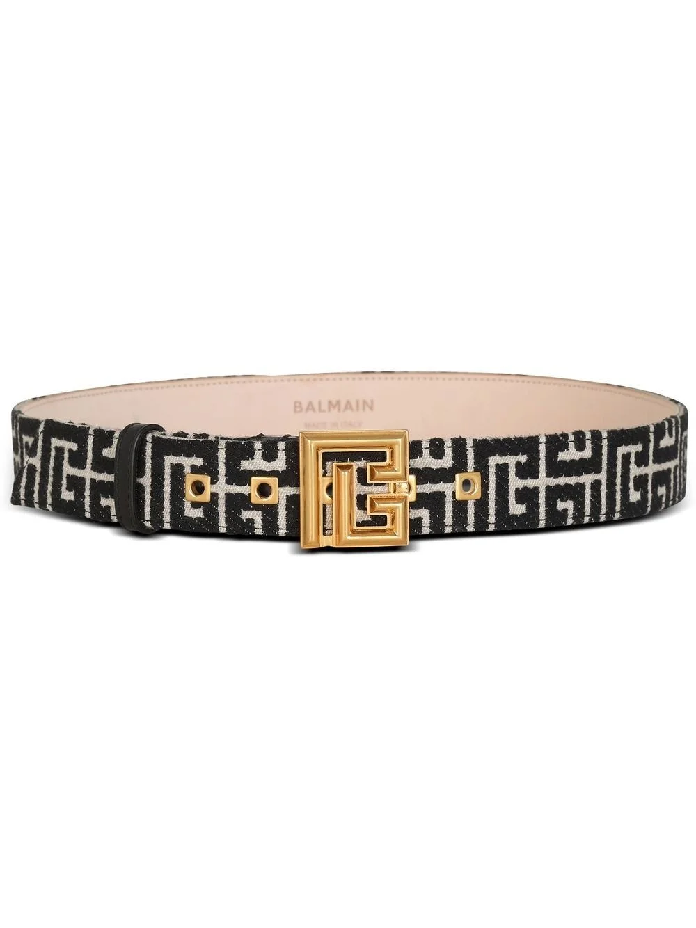 monogram-pattern belt A key house code, the Balmain monogram details this belt, adding a lively finish in signature black and white hues. Made in Italy Composition Cotton 84%, Polyester 16%