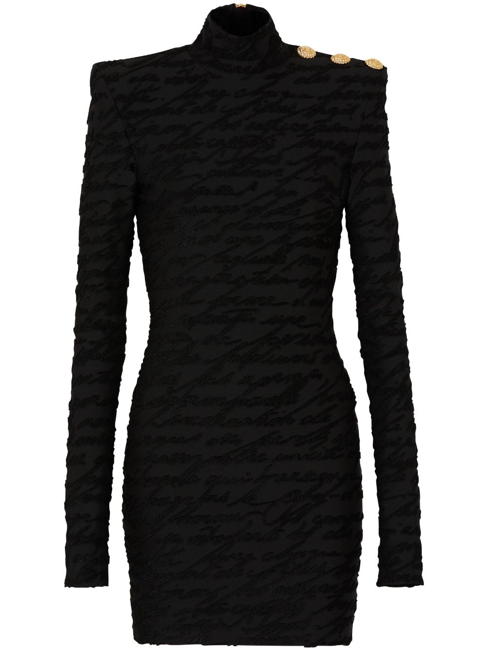 monogram-pattern mini dress Highlights - Black - Rear zip fastening - Bodycon design - Monogram pattern - Embossed gold-tone buttons - High neck - Long sleeves - Straight hem - Thigh-length Imported Composition Viscose 60%, Polyester 40%
