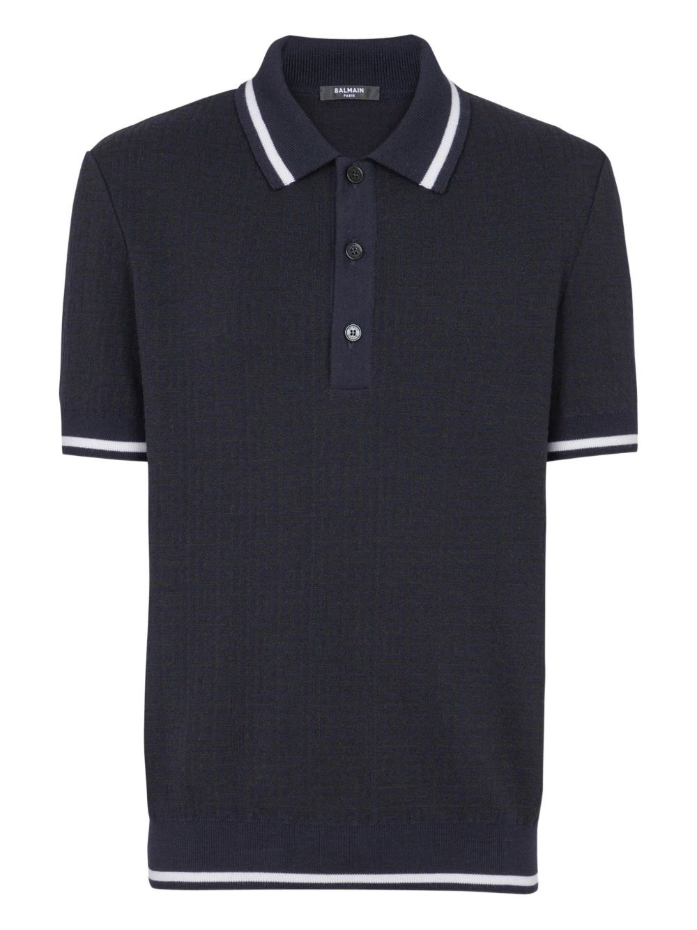 monogram-pattern polo shirt Highlights - Navy blue - Front button placket - Stripe detailing - Polo collar - Short sleeves Made in France Composition Merino 66%, Linen/Flax 31%, Polyamide 3%
