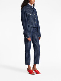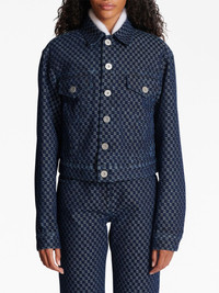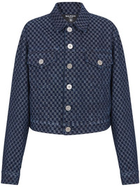 monogram-print denim jacket Balmain's timeless PB monogram pattern honours the founder's initials and his fascination with French labyrinths in its geometric form. For AW23 the maison reimagines the motif, placing it in a miniature checkerboard pattern as displayed on this cropped denim jacket. Highlights - Navy blue - Cotton - Denim - Monogram print - Logo patch to the rear - Classic collar - Front button fastening - Chest flap pockets - Long sleeves - Buttoned cuffs - Straight hem - Cropped Made in Italy Composition Body: Cotton 100% Washing instructions Specialist Cleaning