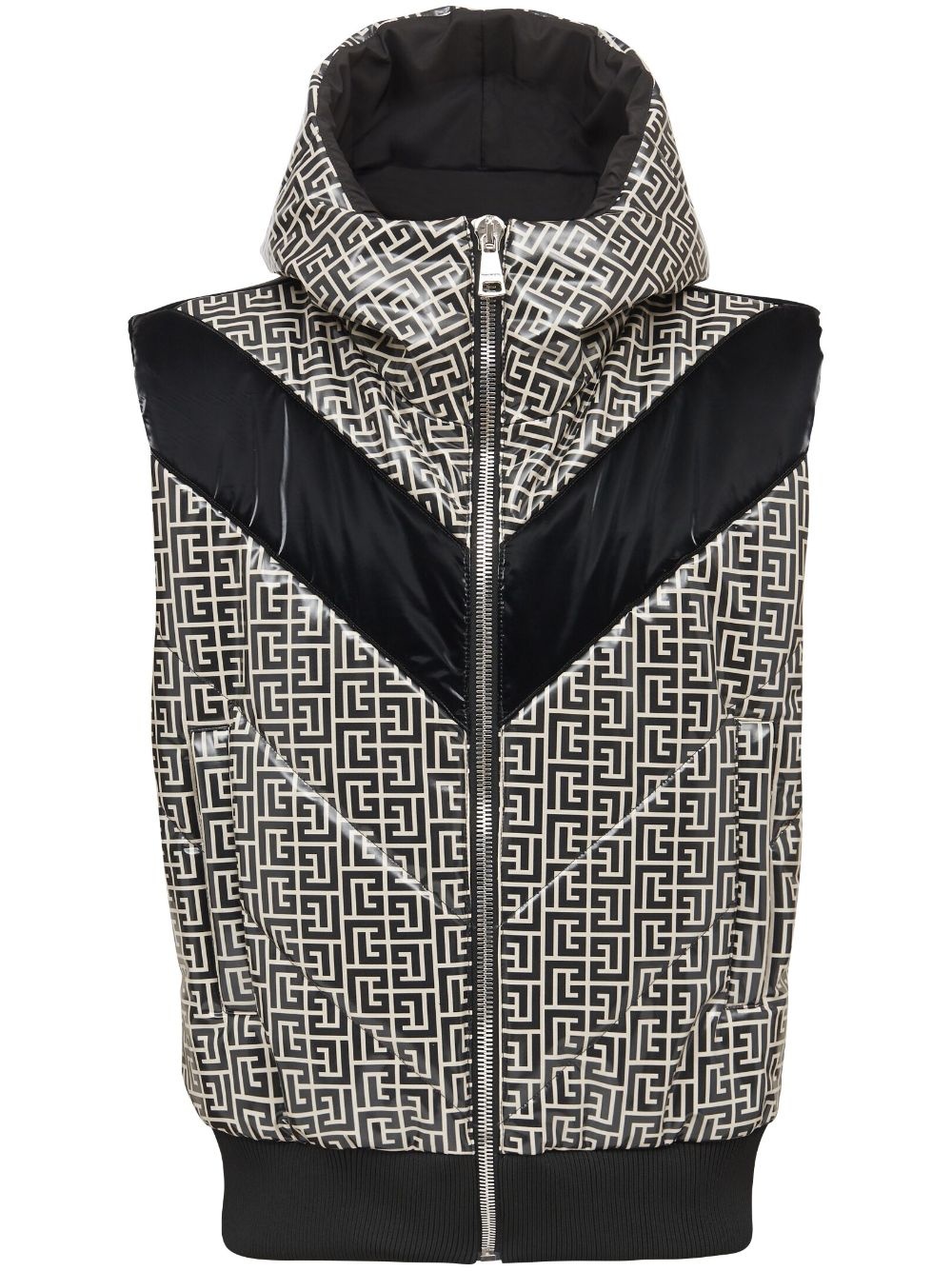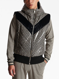 monogram-print puffer gilet This Balmain puffer gilet is adorned with an all-over monogram print, an archival motif utilising Pierre Balmain's initials. It's embellished with black panels and topped with a classic hood. Highlights - Black/white - Padded design - Signature pb monogram print - Classic hood - Front zip fastening - Sleeveless - Two side slit pockets - Ribbed hem Made in Italy Composition Polyamide 80%, Elastane 20%