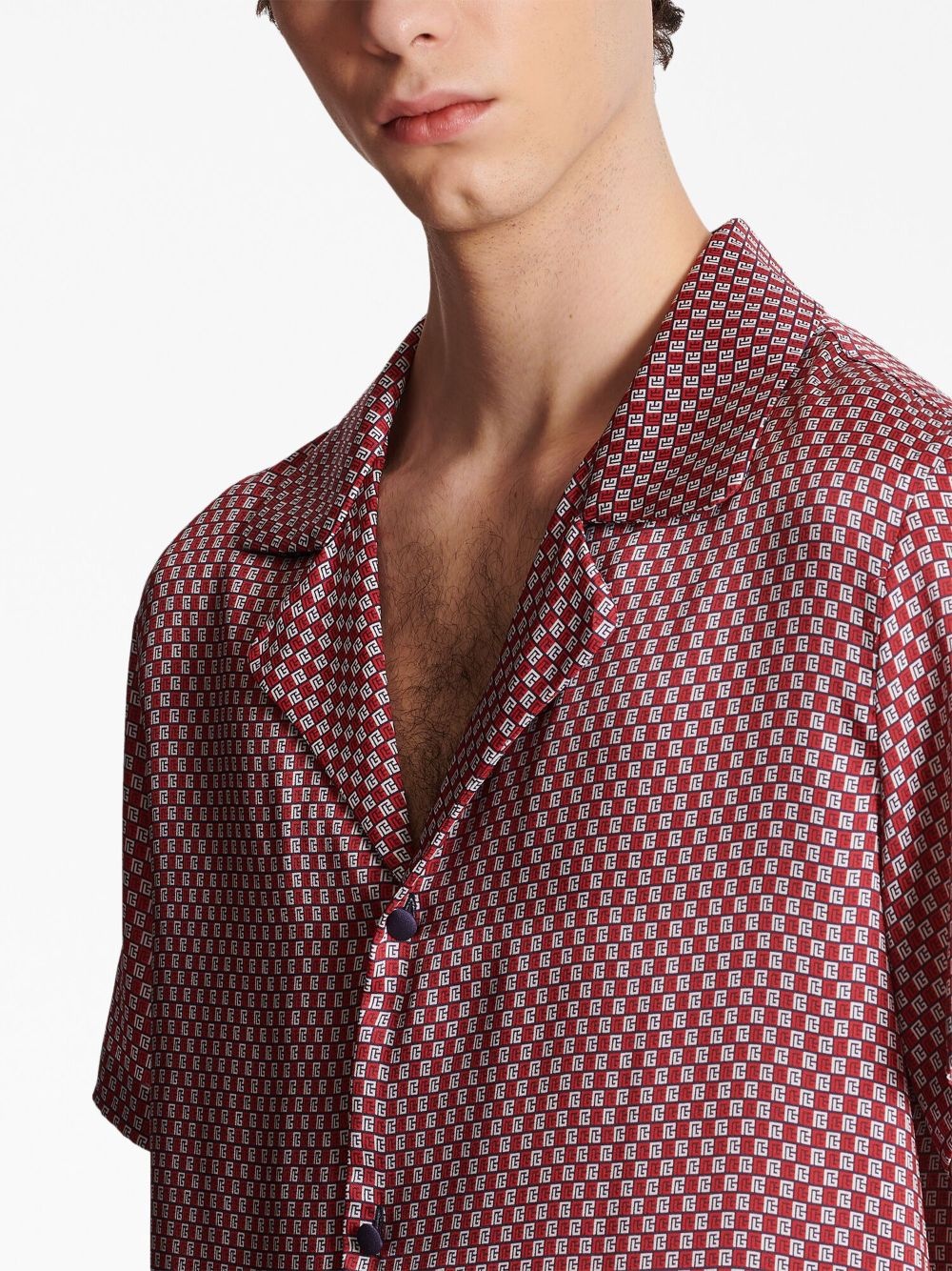 monogram-print short-sleeve shirt Highlights - Red/multicolour - Monogram print - Notched collar - Panelled design - Front lace-up fastening - Short sleeves - Straight hem Made in Italy Composition Polyester 100%