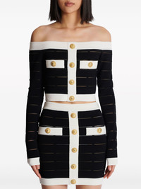 off-shoulder knitted top Eye-catching embossed buttons are a mainstay at Balmain, speaking to the house's opulent aesthetic. They appear in a gold-tone finish here, contrasting with the top’s black and white colourway for an elevated casual look. Highlights - Black/white - Knitted construction - Openwork areas - Contrasting trim - Decorative button detailing - Off-shoulder - Rear zip fastening - Long sleeves - Cropped - Straight hem Made in Italy Composition Viscose 87%, Polyester 12%, Polyamide 1% Washing instructions Read Manufacturer Guidelines