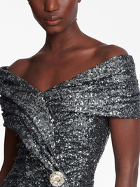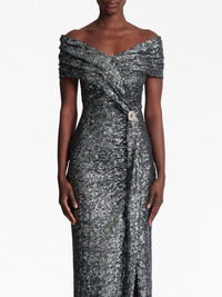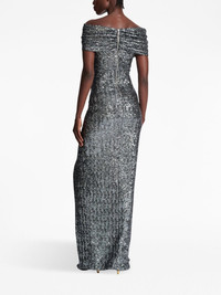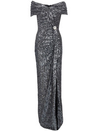 off-shoulder sequin-embellished gown This silver-tone gown from Balmain radiates elegance through its all-over sequin embellishment. Sitting off the shoulder, twist and draped detailing direct the piece to its floor length. Highlights - Silver-tone - Sequin embellishment - Off-shoulder - Twist detailing - Rear zip fastening - Draped design - Empire line - Floor-length Imported Composition Body: Polyester 100% Washing instructions Specialist Cleaning