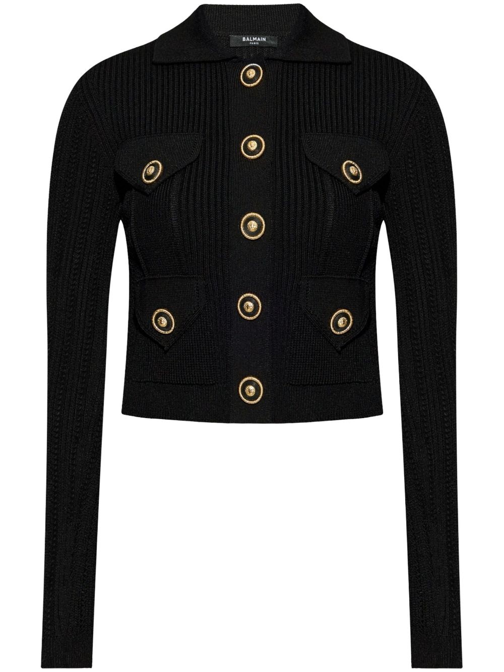 openwork-detailed ribbed-knit cardigan Highlights - Black - Front press-stud fastening - Two front patch pockets - Logo-embossed buttons - Faux pocket detail Made in Italy Composition Outer: Viscose 100%