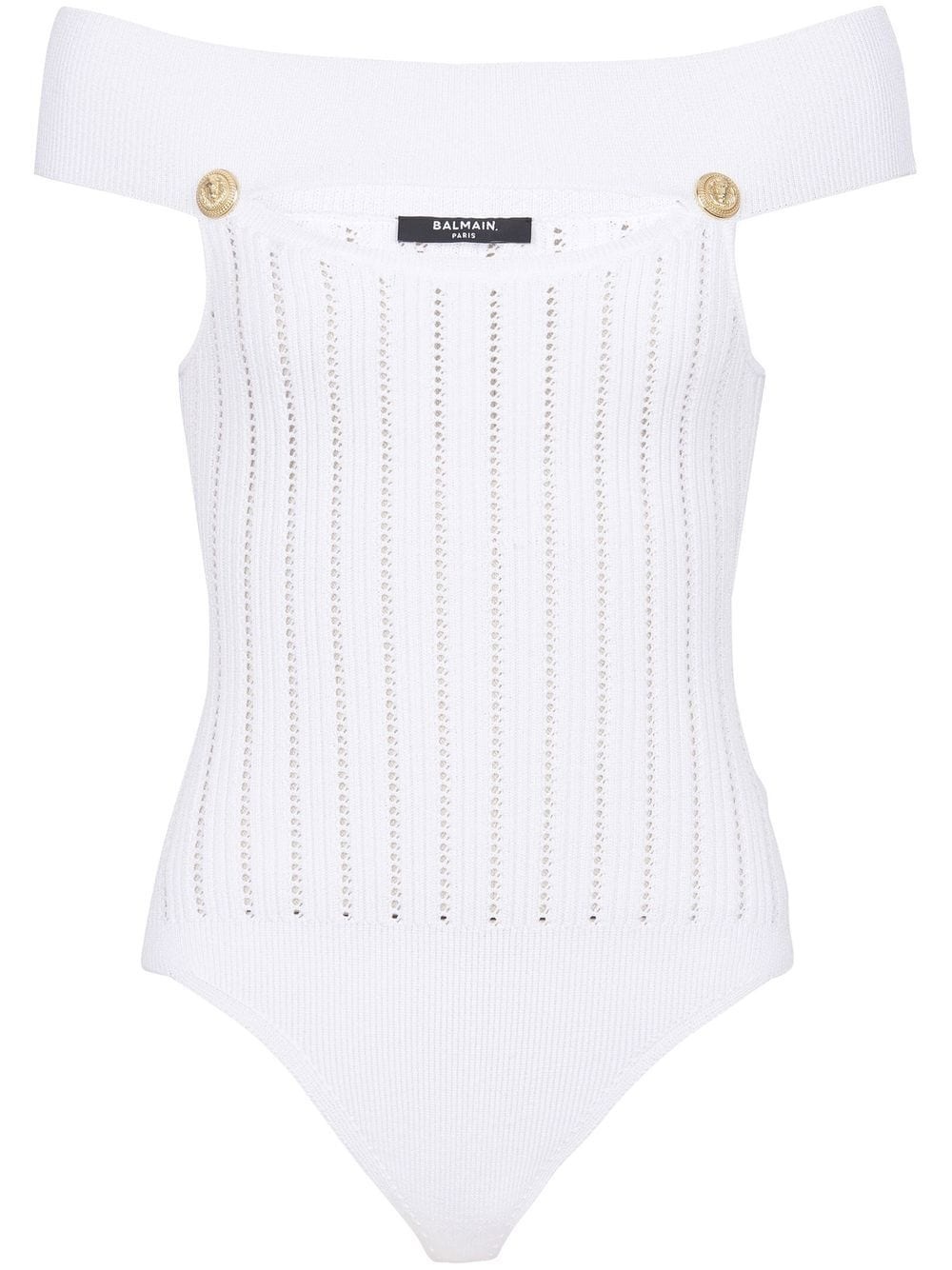 openwork knit bodysuit Sculptural silhouettes take centre stage at Balmain for SS23, as evidenced by this white bodysuit. Boasting a pointelle-knit construction, the off-shoulder silhouette is elevated by the label's signature embossed gold-tone buttons at either side. Highlights - Cloud white - Pointelle knit - Off-shoulder - Cut-out detailing - Sleeveless - Embossed gold-tone buttons - Just a reminder that this piece must be tried on over your own garments. Made in Italy Composition Body: Viscose 83%, Polyamide 17% Washing instructions Specialist Cleaning