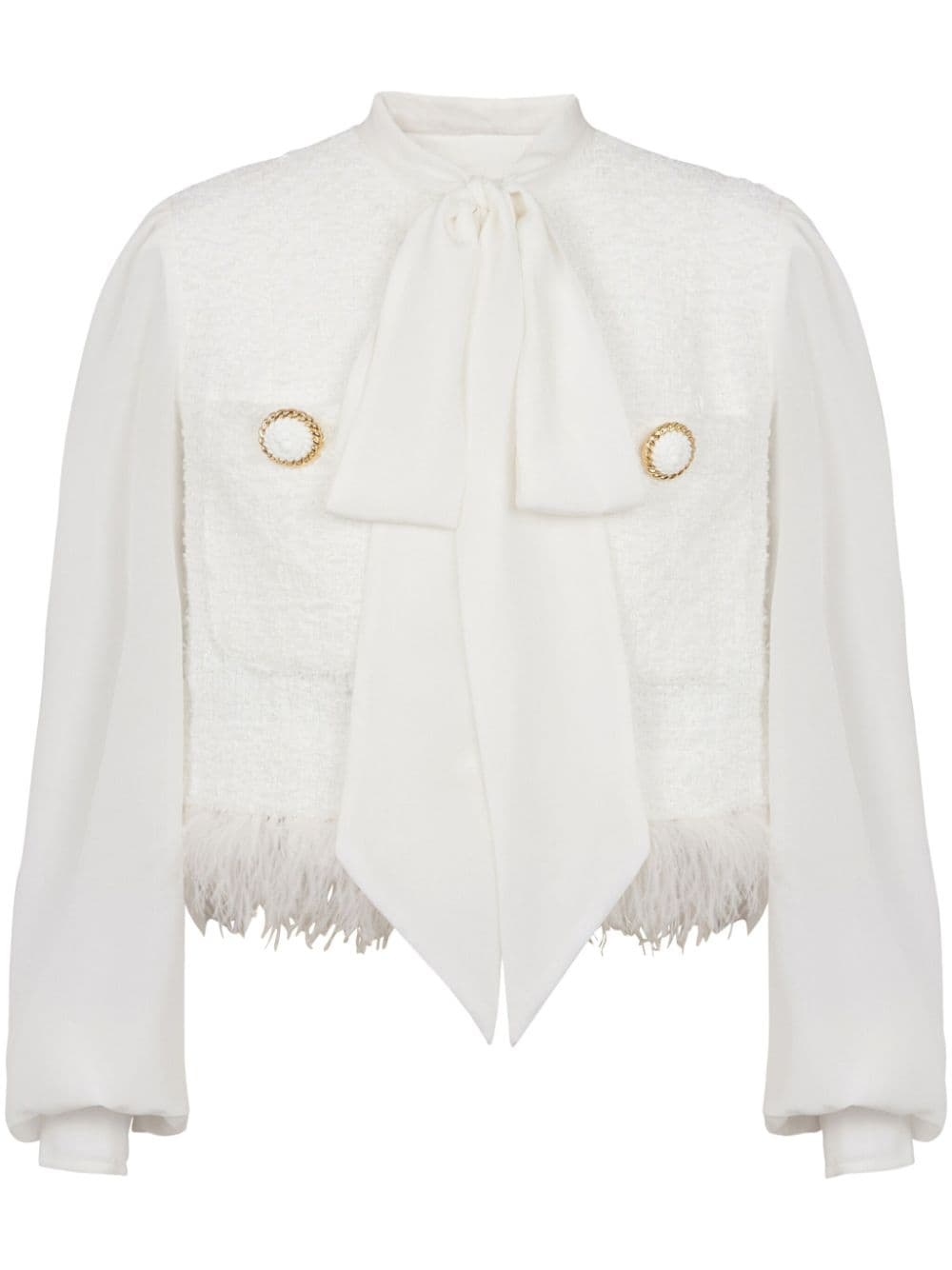 panelled tweed jacket Highlights - White - Cotton blend - Panelled design - Tweed panelling - Crepe texture panels - Pussy-bow collar - Long sleeves - Buttoned cuffs - Two front patch pockets - Feather-trim detailing - Full lining - Front button fastening Imported Composition Polyamide 50%, Cotton 50% Washing instructions Specialist Cleaning