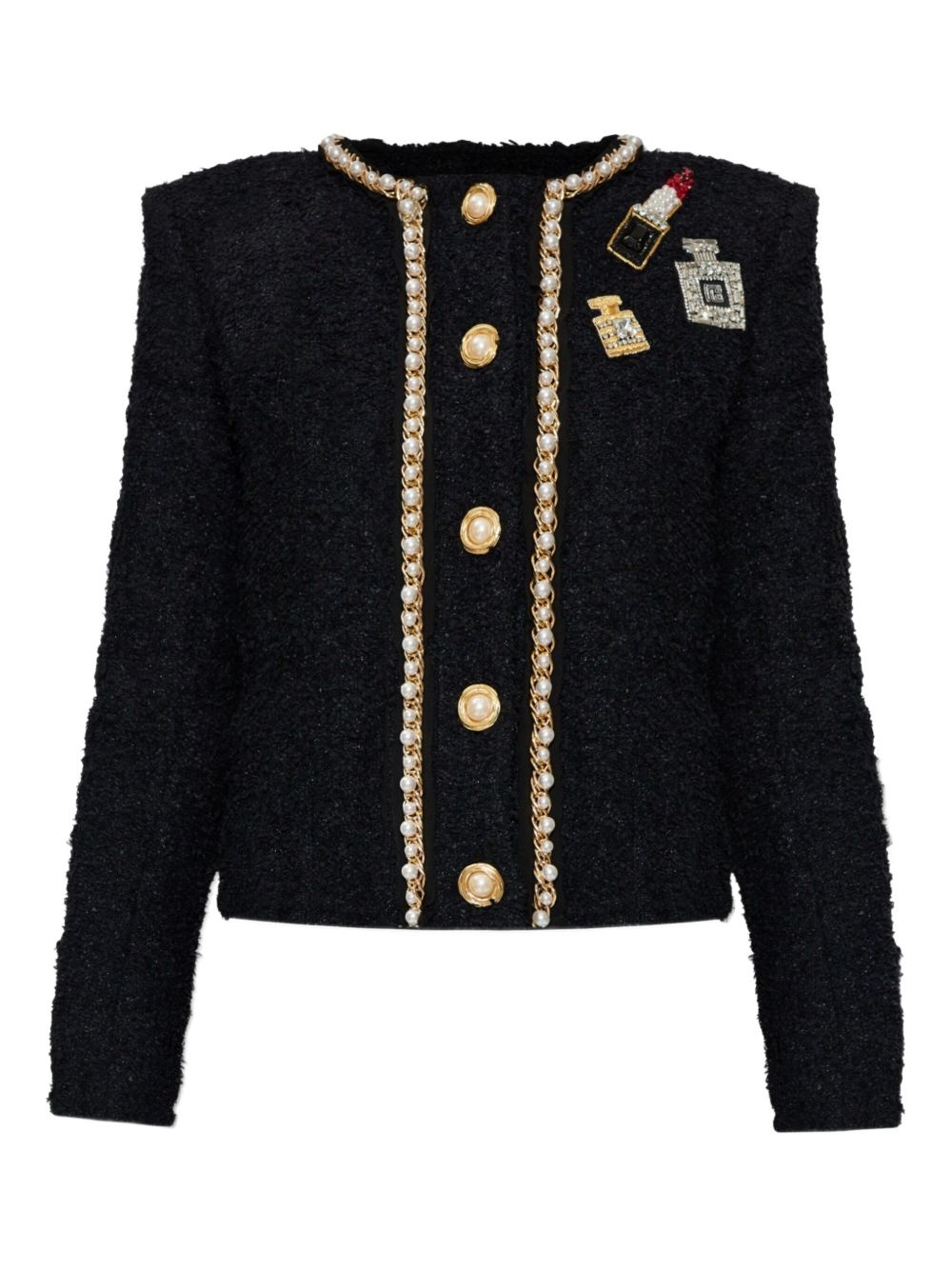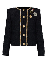 patch-detail tweed jacket Highlights - Black - Front button fastening - Crew neck - Long sleeves - Faux-pearl detailing Imported Composition Cotton 100%, Viscose 100% Washing instructions Read Manufacturer Guidelines