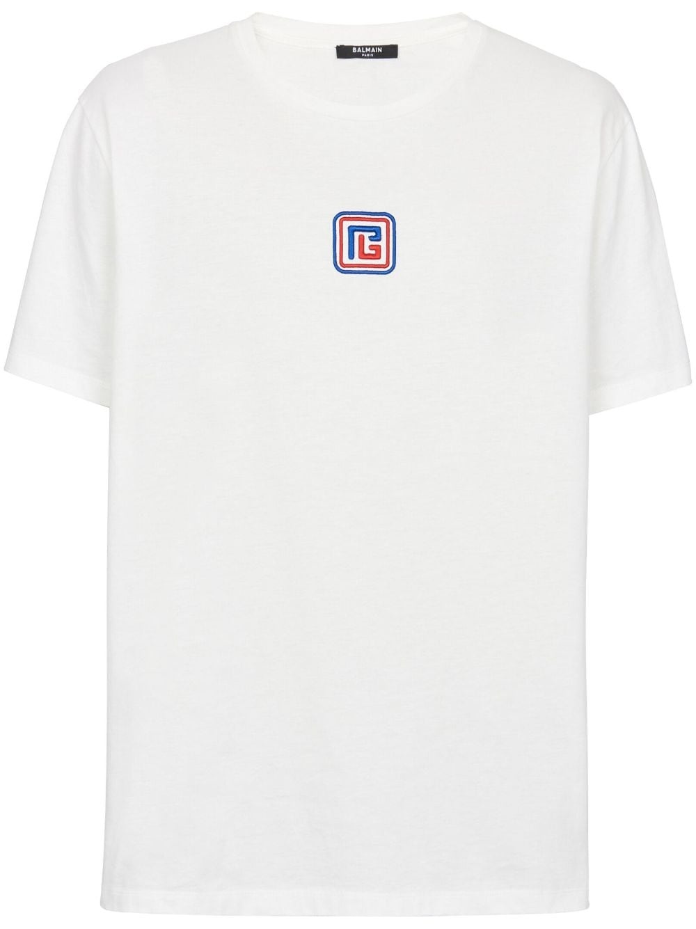PB crew-neck T-shirt Crafted from 100% organic cotton, this Balmain T-shirt arrives in a white hue elevated by a contrasting patch at the chest. Highlights - Red/white/blue - Organic cotton - Crew neck - Short sleeves - Straight hem Imported Composition Organic Cotton 100% SIZE & FIT FittingInformation Designed to be unstructured, offering a loose fit throughout Made from a midweight non-stretch fabric, this piece offers minimal elasticity when worn This piece fits true to size – take your usual size