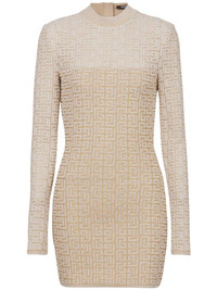 PB Labyrinth-jacquard knit dress Highlights - Beige - Knitted construction - Metallic threading - Semi-sheer panels - Jacquard logo motif - High neck - Rear zip fastening - Long sleeves - Straight hem - Bodycon design Made in France Composition Viscose 76%, Metallized Polyester 16%, Polyester 5%, Nylon 3%