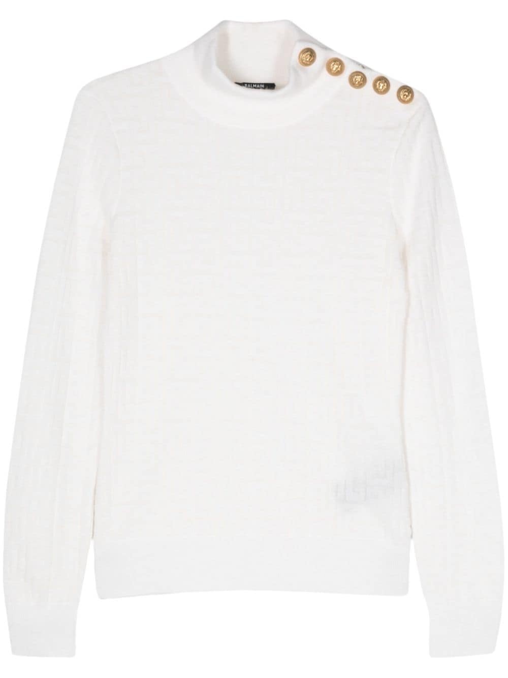 PB-monogram ribbbed jumper Highlights - White - Ribbed knit - Signature pb monogram patterned jacquard - Lion head engraved buttons - Ribbed trim - Mock neck - Long sleeves - Press-stud fastening at the shoulder - Straight hem - Unlined Made in Italy Composition Mohair 35%, Viscose 30%, Polyamide 25%, Wool 10% Washing instructions Dry Clean Only