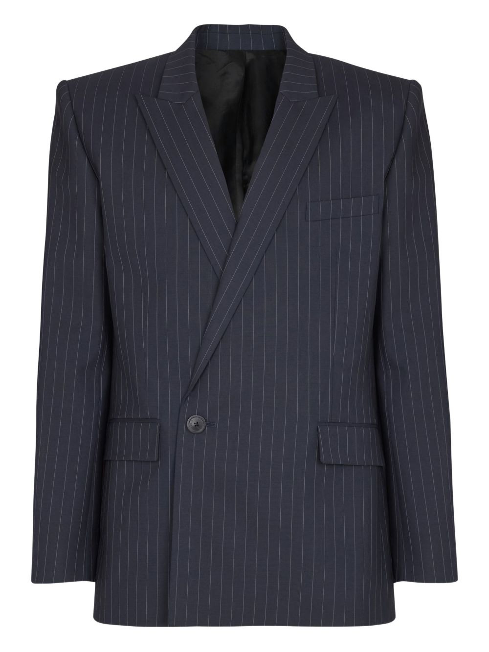 pinstripe double-breasted blazer Highlights - Navy blue - Pinstripe pattern - Double-breasted fastening - Peak lapels - Padded shoulders - Welt pockets Imported Composition Outer: Virgin Wool 98%, Elastane 2% Lining: Cupro 100% Washing instructions Read Manufacturer Guidelines