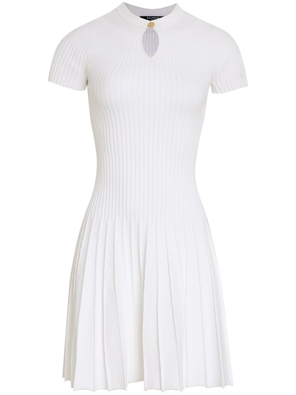 pleated ribbed-knit mini dress Highlights - White - Ribbed knit - Pleat detailing - Front button fastening - Keyhole neck - Short sleeves - Fitted waistline - Pleated skirt - Straight hem - Thigh-length Made in France Composition Viscose 67%, Polyester 33%