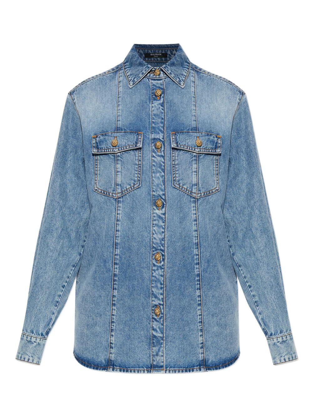 point-collar denim shirt Highlights - Light blue - Front button fastening - Two chest flap pockets - Buttoned cuffs - Point collar - Topstitching Made in Italy Composition Lyocell 100% Washing instructions Read Manufacturer Guidelines