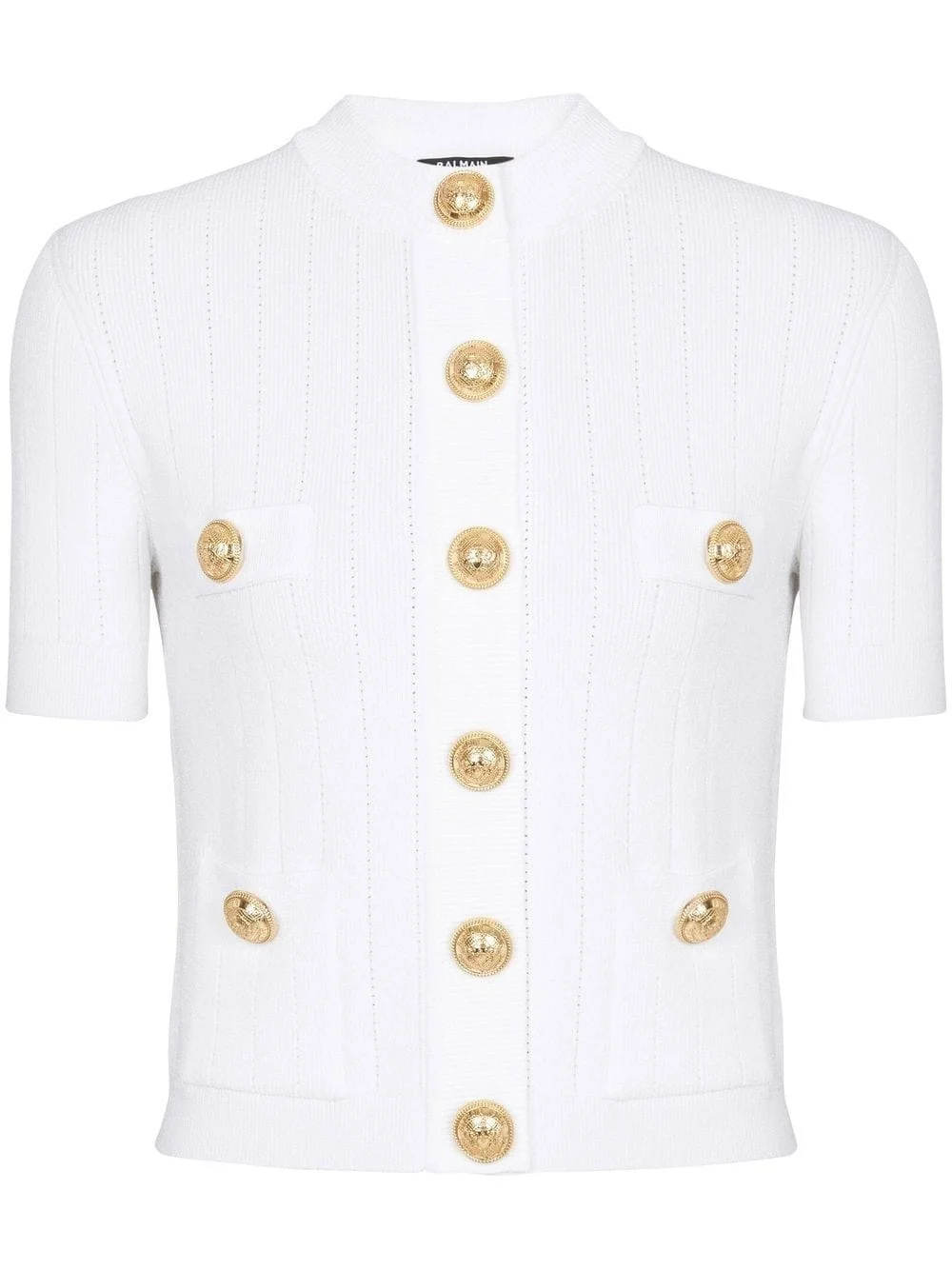 pointelle-knit cardigan Highlights - Off-white - Pointelle knit - Embossed gold-tone buttons - Four front patch pockets - Round neck - Short sleeves - Straight hem Made in France Composition Viscose 83%, Polyester 17% SIZE & FIT Measurement LENGTH 19.29 in(49 cm) WAIST 29.92 in(76 cm) SLEEVE LENGTH 9.05 in(23 cm) FittingInformation Designed for a slim fit that sits just away from the body offering a close yet comfortable fit Made with a midweight knit, this piece offers some stretch This piece fits true to size – take your usual size Washing instructions Specialist Cleaning