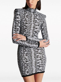 python-jacquard knitted minidress Highlights - White/black - Fitted - All-over snakeskin jacquard - Contrasting trim - Mock neck - Rear zip fastening - Pinched shoulders - Long sleeves - Straight hem - Thigh-length Made in France Composition Viscose 84%, Polyamide 8%, Cupro 8% Washing instructions Read Manufacturer Guidelines