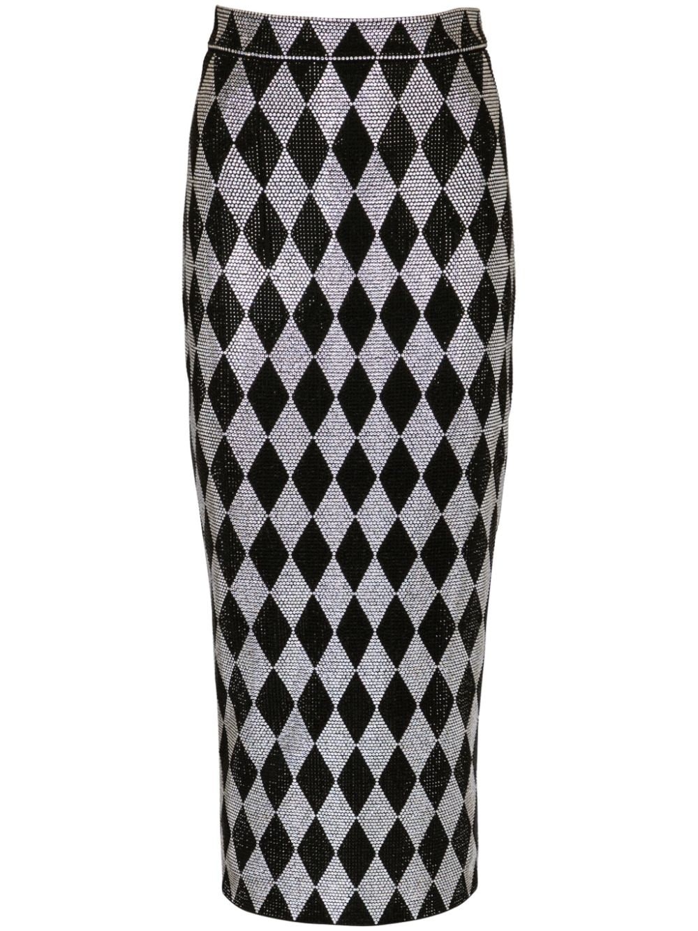 rhinestone-embellished midi skirt Highlights - Black - Knitted construction - Diamond pattern - Rhinestone embellishment - Rear zip fastening - Rear slit - Unlined - Below-knee length - Straight hem Made in Italy Composition Viscose 90%, Polyamide 10% Washing instructions Read Manufacturer Guidelines