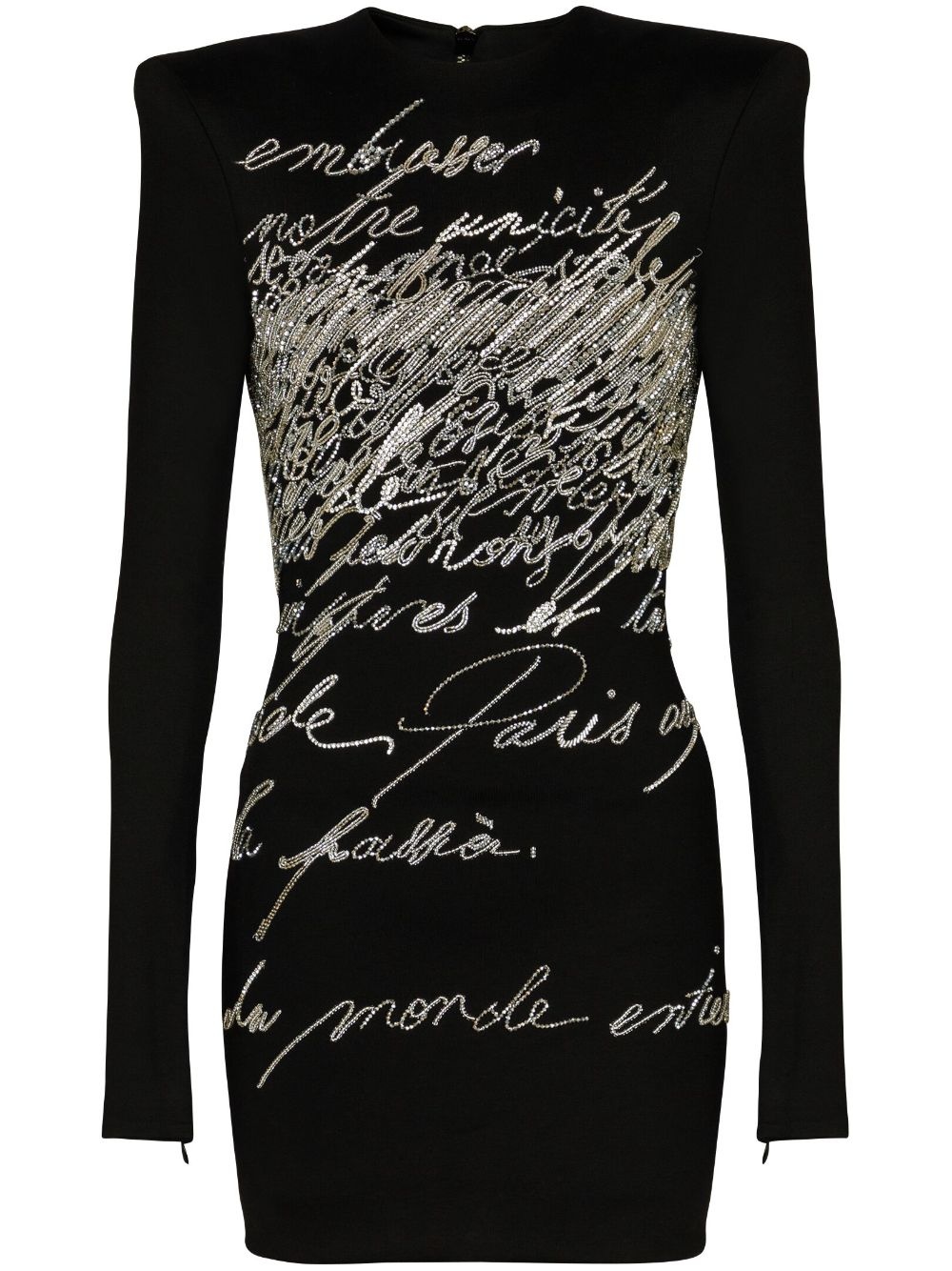 rhinestone-embellished mini dress Highlights - Black - Velvet - Rhinestone embellishment - Embroidered design - Crew neck - Long sleeves - Concealed rear zip fastening - Straight hem - Thigh-length Made in Italy Composition Viscose 90%, Polyamide 10%