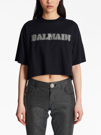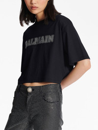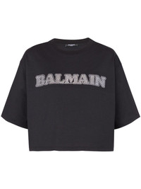 rhinestone-logo cropped cotton T-shirt Balmain opts for a boldly branded look with this T-shirt. Crafted from cotton, it arrives in a black colourway with a rhinestone-embellished logo at the chest while the cropped silhouette cements its contemporary appeal. Highlights - Black - Cotton - Rhinestone embellished logo - Crew neck - Short sleeves - Straight hem - Cropped Made in Italy Composition Cotton 100% Washing instructions Specialist Cleaning