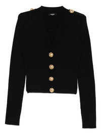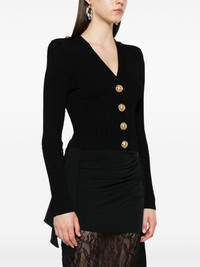 ribbed button-up cardigan Highlights - Black - Ribbed texture - V-neck - Long sleeves - Button fastening - Shoulder buttons Made in France Composition Viscose 83%, Polyester 17% SIZE & FIT Model measurements Height 5 ft 10 in(1.78 m) Bust/Chest 33.85 in(86 cm) Hips 36.61 in(93 cm) Waist 26.77 in(68 cm) Washing instructions Dry Clean Only