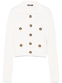 ribbed cardigan Highlights - White - Front press-stud fastening - Ribbed cuffs and hem - Jacquard logo motif - Polo collar Made in Italy Composition Viscose 84%, Polyester 16% SIZE & FIT Model measurements Height 5 ft 10 in(1.77 m) Bust/Chest 31.88 in(81 cm) Hips 36.22 in(92 cm) Waist 24.01 in(61 cm) FittingInformation Designed for a close fit throughout Made with a midweight knit, this piece offers some stretch